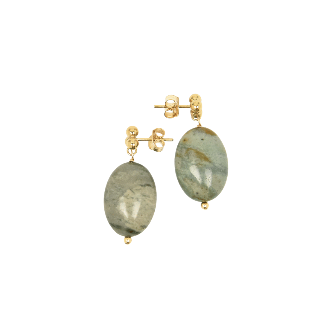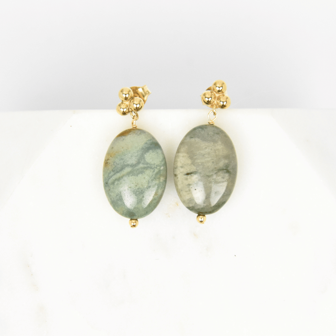 13x18mm Ocean Jasper smooth oval gemstone on a 3 ball 14k gold filled post.