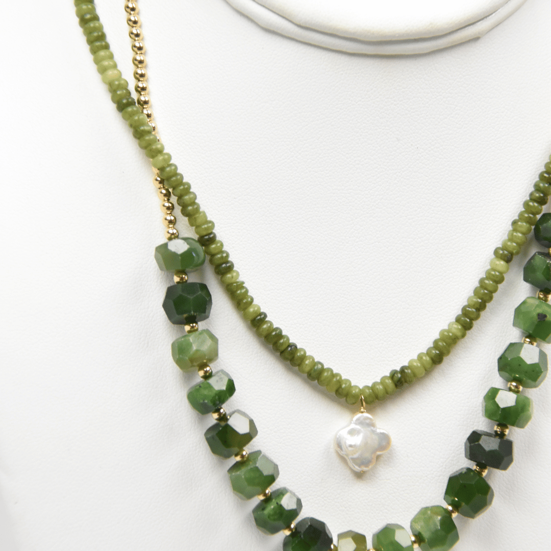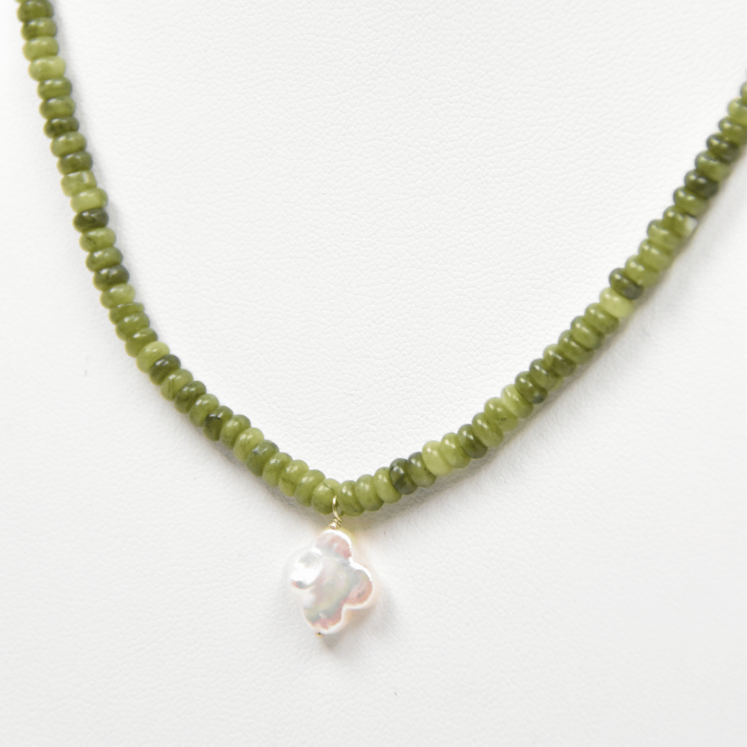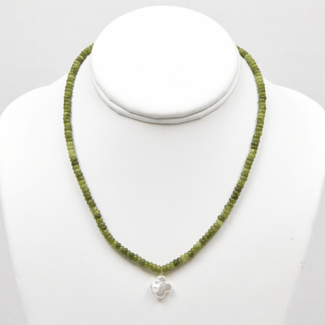 4mm Serpentine Green Jade rondelles with a 12mm freshwater pearl clover pendant.