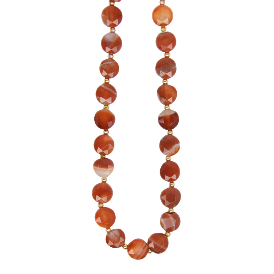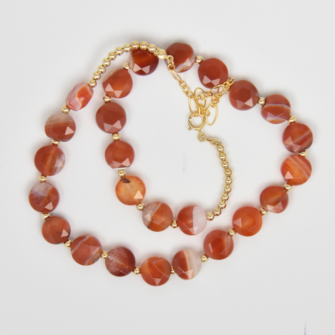 10mm Striped Red Agate coins alternating with 3mm 14k gold filled beads with 3" Delicate Chain extension and spring ring closure