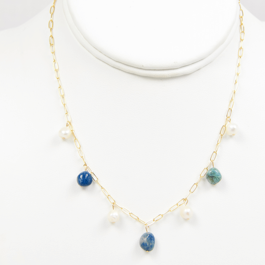 6mm Stertulite Nugget stones with freshwater pearls dangling on our classic paperclip chain.